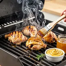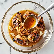 Przygotuj glazurę: do średniej miski wlej miód (60 g). Jeśli miód jest gęsty, umieść słoik w misce z ciepłą wodą na 2-3 minuty i zamieszaj, aż stanie się płynny. Dodaj musztardę (30 g), olej rzepakowy (30 g), ocet jabłkowy (15 g), sok i startą skórkę z połowy cytryny (ok. 50 g soku/60 g miąższu — wyciśnij cytrynę ręcznie nad misą). Przeciśnij przez praskę czosnek (10 g). Dodaj paprykę słodką (2 g), sól (6 g) i pieprz (2 g). Mieszaj łyżką lub trzepaczką aż składniki się połączą i powstanie gładka, lepka emulsja.