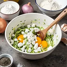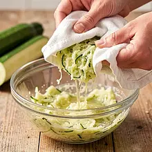 Umyj cukinię pod zimną wodą, odetnij końce. Zetrzyj cukinię na tarce o dużych oczkach do dużej miski. Jeśli cukinia ma dużo nasion, delikatnie je usuń łyżką przed tartą. Po starciu posól cukinię 2 g soli (z podanej ilości) i wymieszaj ręką, by sól rozprowadziła się równomiernie. Odstaw na 8-10 minut — sól sprawi, że cukinia wypuści wodę.