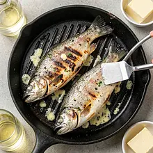 Po zdjęciu z grilla przenieś pstrągi na talerz wyłożony pergaminem i przykryj luźno folią aluminiową. Odpoczywaj 4–5 minut — to pozwoli sokom rozprowadzić się równomiernie i masłu wniknąć w mięso.