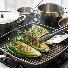 Połóż połówki sałaty na gorącej patelni grillowej, przeciętą stroną do dołu. Grilluj przez 1-2 minuty bez poruszania, aż pojawią się wyraźne, ciemne paski od grilla, a liście na brzegach lekko zwiędną. Następnie za pomocą szczypiec kuchennych delikatnie obróć sałatę na drugą stronę i grilluj przez kolejną minutę. Sałata powinna być z zewnątrz przypieczona, a w środku wciąż chrupiąca. Zdejmij z patelni.