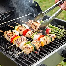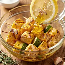 Przygotuj marynatę: wyciśnij sok z połowy cytryny (ok. 60 ml) bez pestek do miski, dodaj olej rzepakowy (30 g), rozgnieciony czosnek (15 g) oraz paprykę słodką (4 g). Dodaj sól (6 g) i pieprz czarny (2 g). Wymieszaj widelcem lub trzepaczką, aż składniki połączą się w jednorodną, lekko tłustą emulsję. Pokrój pierś z kurczaka na równe kawałki wielkości około 2-3 cm – tak, aby wszystkie kawałki nagrzewały się równomiernie. Włóż kawałki kurczaka do szerokiej, szklanej lub ceramicznej miski i zalej marynatą. Wymieszaj tak, by każdy kawałek był otulony marynatą, przykryj folią i odstaw na 15-20 minut w temperaturze pokojowej.