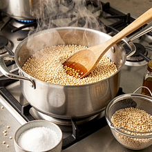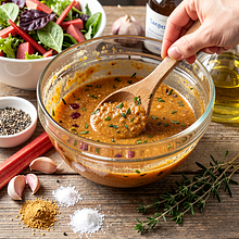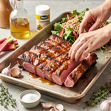 Przygotuj rabarbarową bazę glazury: umyj rabarbar, odetnij twarde końcówki i pokrój łodygi na około 1 cm kawałki. W średnim rondelku umieść pokrojony rabarbar, miód i ocet jabłkowy. Podgrzewaj na średnim ogniu przez 8–10 minut, często mieszając drewnianą łyżką, aż rabarbar się rozpadnie i powstanie gęsty, lekko syropowy sos. Jeśli jest zbyt kwaśny, dodaj łyżeczkę miodu więcej. Zdjąć z ognia i przestudzić do ciepłej temperatury.