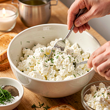 Przygotuj masę serową: przełóż twaróg do średniej miski. Rozdrobnij twaróg widelcem przez około 30–45 sekund, aż masa stanie się kremowa i bez dużych grudek. Dodaj 1 g soli (szczypta) i 1 g świeżo zmielonego pieprzu (szczypta). Jeśli używasz koperku, drobno posiekaj około 10 g (kilka gałązek) i dodaj do twarogu. Wymieszaj 1–2 minuty, aż składniki się połączą — masa powinna być jednorodna i łatwa do rozsmarowania.