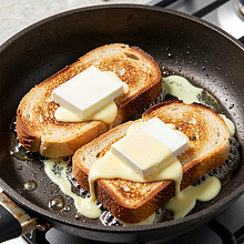 Rozgrzej patelnię na średnim ogniu (środek skali) przez około 1–2 minuty. Na rozgrzaną patelnię włóż masło (15 g) i poczekaj 20–30 sekund, aż się roztopi i zacznie lekko się pienić, ale nie brązowieć. Połóż kromki chleba na patelni i smaż 2–3 minuty z każdej strony, aż będą złote i chrupiące. Grzanki są gotowe, gdy brzeg chleba jest rumiany, a powierzchnia ma równomierny złoty kolor.