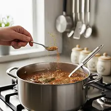 Wlej do garnka całą zawartość puszki z krojonymi pomidorami oraz bulion warzywny. Dokładnie zamieszaj, zeskrobując drewnianą łyżką wszystkie smakowite drobinki, które przywarły do dna garnka. Zwiększ moc palnika i doprowadź całość do wrzenia. Następnie zmniejsz ogień do minimum, przykryj garnek pokrywką i gotuj na wolnym ogniu przez około 15 minut, aby smaki się połączyły.