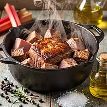 Mazurski gulasz z dzika z rabarbarem i kaszą pęczak to wiosenne połączenie dziczyzny o głębokim, leśnym smaku z lekko kwaskowym rabarbarem i sycącym pęczakiem. Danie łączy tradycję mazurską (dziczyzna, wędzone dodatki) z wiosennym twistem (rabarbar, szczaw), dając złożony sos o słodko-kwaśno-głębokim profilu. Idealne na rodzinny obiad lub świąteczne spotkanie na łonie natury. Podawać gorące na pęczaku, z natką pietruszki i opcjonalną łyżką śmietany dla złagodzenia kwasowości; sprawdzi się z kiszoną kapustą lub młodymi warzywami na boku.