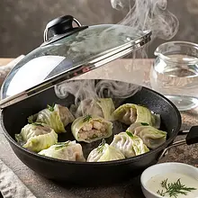 Gdy spody są złote, wlej na patelnię 80 ml wody (ostrożnie, para będzie intensywna) i natychmiast przykryj szczelną pokrywką. Zmniejsz ogień do średniego i gotuj pod przykryciem 4–6 minut, aż woda odparuje i gyoza będą miękkie w środku.