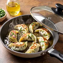 Rozgrzej nieprzywierającą patelnię (najlepsza 26–28 cm) z 1 łyżką oleju rzepakowego na średnio-wysokim ogniu. Ułóż gyoza spodnią stroną do patelni, nie przepełniaj (ok. 8–10 sztuk na raz). Smaż 2–3 minuty aż spody będą złote i lekko chrupiące.