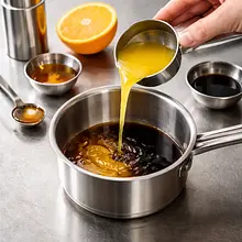W małym rondelku połącz miód (30 g), sok z pomarańczy (50 ml) i ocet balsamiczny (15 g). Dodaj suszony tymianek (2 g) oraz 1 szczyptę soli (2 g). Podgrzewaj na średnio-małym ogniu, mieszając drewnianą łyżką, aż mieszanina zacznie lekko bulgotać. Zmniejsz ogień i redukuj 4–6 minut — glazura powinna zgęstnieć do konsystencji syropu, który oblepi łyżkę i będzie błyszczący. Zdejmij z ognia i odstaw 2 minuty (gęstnieje dalej).