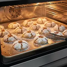 Wstaw blachę do nagrzanego piekarnika i piecz przez 10-12 minut. Ciasteczka są gotowe, gdy na ich powierzchni pojawią się wyraźne pęknięcia, a brzegi będą lekko zwarte w dotyku. Środek powinien pozostać miękki – stwardnieje podczas studzenia. Nie piecz ich zbyt długo, bo stracą swoją cudowną, ciągnącą się konsystencję.