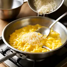 Dodaj starty ser i kontynuuj smażenie, aż ser się roztopi i wszystko się połączy.
