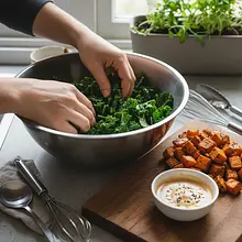 Umieść porwane liście jarmużu w dużej misce. Dodaj pozostałą łyżkę (15g) oliwy z oliwek i 2 szczypty soli. Teraz wykonaj kluczową czynność: 'masuj' liście jarmużu dłońmi przez około 2-3 minuty. Ugniataj je i pocieraj, jakbyś wyrabiał ciasto. Zauważysz, że jarmuż zmieni kolor na intensywniejszy zielony, zmniejszy swoją objętość i stanie się znacznie bardziej miękki i delikatny.