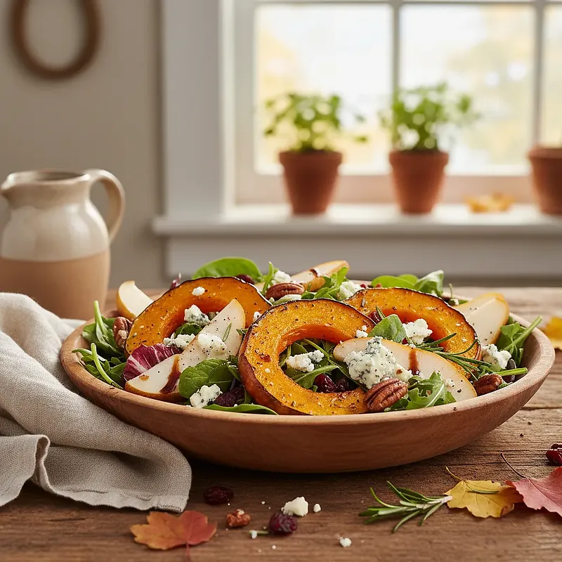 Ta sałatka to kwintesencja jesieni na talerzu. Łączy w sobie słodycz pieczonej dyni Hokkaido, soczystość dojrzałej gruszki, wyrazisty i słony smak sera gorgonzola oraz chrupkość prażonych orzechów włoskich. Całość spaja aksamitny, miodowo-balsamiczny sos vinaigrette, który doskonale balansuje wszystkie smaki. Jest to danie nie tylko niezwykle smaczne, ale również efektowne wizualnie dzięki kontrastowi kolorów: pomarańczowej dyni, zieleni rukoli, czerwieni radicchio i bieli sera z niebieskimi żyłkami. Idealnie sprawdzi się jako elegancka przystawka podczas uroczystej kolacji, lekki, ale sycący lunch, a także jako dodatek do dań głównych, na przykład pieczonych mięs. To propozycja dla każdego, kto ceni sobie sezonowe składniki i niebanalne połączenia smakowe.