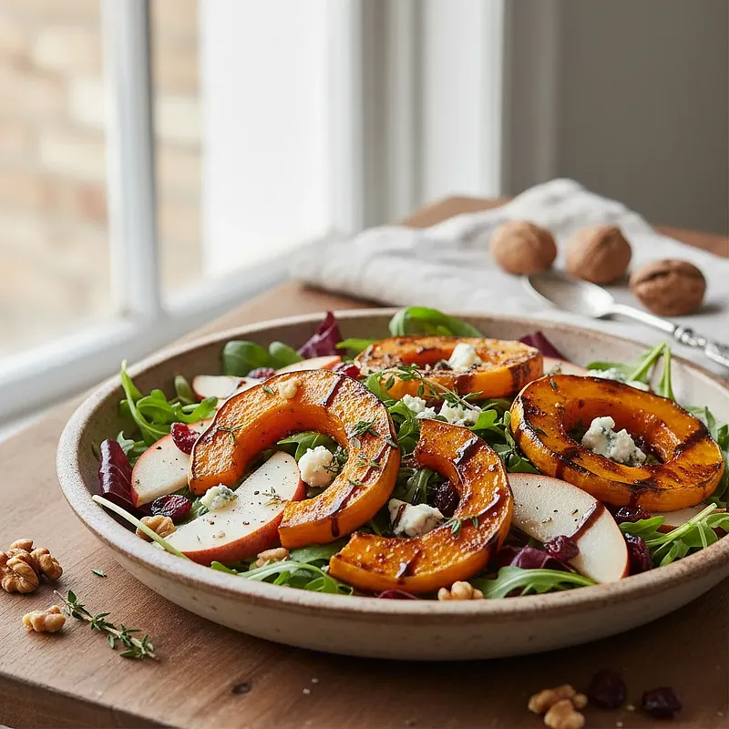 Ta sałatka to kwintesencja jesieni na talerzu. Łączy w sobie niezwykłe bogactwo smaków i tekstur, tworząc kompozycję idealną na chłodniejsze dni. Słodycz delikatnie skarmelizowanej, pieczonej dyni hokkaido idealnie komponuje się z soczystą, orzeźwiającą gruszką. Całość dopełnia wyrazisty, słono-pikantny smak sera gorgonzola, który dodaje daniu charakteru i głębi. Chrupiące, lekko podprażone orzechy włoskie wprowadzają przyjemny element teksturalny, a aksamitny dressing na bazie octu balsamicznego, miodu i musztardy Dijon spaja wszystkie składniki w harmonijną całość. Wizualnie sałatka zachwyca kontrastem kolorów: intensywnego pomarańczu dyni, zieleni sałat i bieli sera z niebieskimi żyłkami. Doskonale sprawdzi się jako elegancka przystawka, lekki lunch lub dodatek do pieczonych mięs, np. piersi z kaczki.