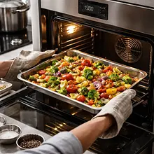 Nagrzej piekarnik do 200°C (góra-dół) lub 190°C z termoobiegiem. Przygotuj blachę wyłożoną papierem do pieczenia. Dynię obierz obieraczką (jeśli skórka jest twarda), przekrój wzdłuż, wydrąż nasiona łyżką i pokrój miąższ w kostkę o boku ok. 2 cm. Marchew obierz, odetnij końcówki i pokrój na plastry ukośne o grubości około 7-8 mm lub na kawałki podobnej wielkości co dynia, aby piekły się równomiernie.