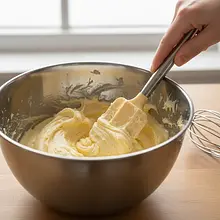 Teraz będziesz dodawać suche składniki (mąkę z proszkiem i solą) na przemian z gęstą śmietaną. Zmniejsz obroty miksera do najniższych. Dodaj 1/3 mieszanki mącznej i miksuj tylko do połączenia. Następnie dodaj połowę śmietany (ok. 1.5 łyżki) i znów krótko zmiksuj. Powtórz: 1/3 mąki, reszta śmietany, i na końcu reszta mąki. Mieszaj tylko do momentu, aż składniki się połączą w jednolitą masę. Zbyt długie mieszanie po dodaniu mąki spowoduje, że ciasto będzie twarde.