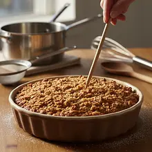 Po około 50 minutach pieczenia sprawdź, czy ciasto jest gotowe. Wbij w sam środek ciasta drewniany patyczek do szaszłyków. Jeśli po wyjęciu patyczek jest suchy i nie ma na nim surowego ciasta, wypiek jest gotowy. Jeśli są na nim wilgotne okruszki, to dobrze, ale jeśli jest płynne ciasto, piecz jeszcze przez 5-10 minut i powtórz test.