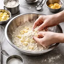 Pokrój 125 g zimnego masła na małe kostki (ok. 1 cm). Dodaj do mąki i szybko rozcieraj palcami (metodą "sable") lub użyj malaksera — pracuj do momentu, gdy mieszanka przypomina gruboziarnistą bułkę tartą z pojedynczymi grudkami masła wielkości grochu (około 2–4 minuty ręcznie).