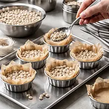Wyłóż każdą tartaletkę papierem do pieczenia i wypełnij ciężarkami (suche fasole, kulki do pieczenia lub specjalne ciężarki). Piecz 12 minut, usuń papier z ciężarkami i piecz kolejne 5–7 minut, aż brzegi będą złociste, a spód suchy.