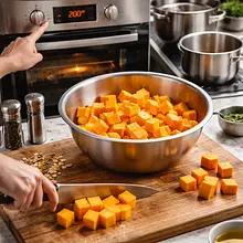 Rozgrzej piekarnik do 200°C. Pokroj 400 g dyni w równe kostki (ok. 2–3 cm). W misce wymieszaj częściowo dynię z 15 g oliwy i szczyptą soli (z zapasu 3 g). Rozłóż na blaszce wyłożonej papierem do pieczenia i piecz 25–30 minut, aż kawałki będą miękkie i lekko skarmelizowane na brzegach — sprawdź widelcem, powinny łatwo się rozgniatać.