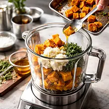 Przełóż upieczoną dynię do misy blendera. Dodaj 180 g koziego sera, 30 g miodu i listki z 6 g świeżego tymianku (odciśnięte z łodyżek). Zmiksuj na gładki krem. Dopraw do smaku 2 g pieprzu i dodatkową szczyptą soli, jeśli potrzeba. Konsystencja powinna być aksamitna, łatwa do nakładania łyżką lub rękawem cukierniczym.