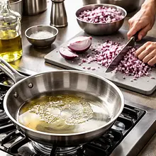 Na średniej patelni rozgrzej pozostałą oliwę (ok. 15 g) na niskim ogniu. Pokrój 300 g czerwonej cebuli w cienkie piórka. Wrzuć cebulę na patelnię, posyp 30 g brązowego cukru i smaż powoli przez 18–22 minuty, mieszając co 1–2 minuty, aż cebula będzie miękka i uzyska głęboki bursztynowy kolor. Jeśli zacznie się przypalać, zmniejsz ogień i dodaj 1–2 łyżki (15–30 ml) wody, aby odessać skarmelizowane resztki z dna patelni.