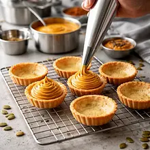 Na przygotowane, przestudzone spody nakładaj krem dyniowy: użyj rękawa cukierniczego z okrągłą końcówką lub łyżki — nakładaj po ok. 20–25 g kremu do każdej tartaletki, tak aby wypełnić do 3/4 wysokości. Na wierzch połóż łyżeczkę karmelizowanej cebuli (ok. 10–12 g), następnie pojedynczy plasterek lub kruszonka z prosciutto. Posyp opcjonalnie 2–3 g prażonych pestek dyni i 6–8 g nasion granatu w każdej tartaletce (jeśli używasz).