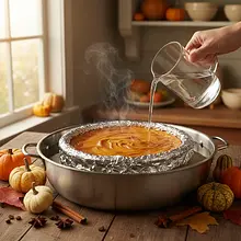 Przygotuj kąpiel wodną. Owiń tortownicę z zewnątrz dwiema warstwami folii aluminiowej, bardzo szczelnie, aby woda nie dostała się do środka. Wstaw owiniętą formę do większego naczynia żaroodpornego lub głębokiej blachy. Zagotuj wodę w czajniku i ostrożnie wlej wrzątek do większego naczynia, tak aby sięgał do połowy wysokości tortownicy.