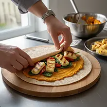 Teraz najważniejszy krok: zwijanie. Złóż dolną krawędź tortilli do środka, przykrywając część nadzienia. Następnie zagnij do środka lewy i prawy bok. Trzymając boki, zacznij ciasno rolować wrapa od dołu ku górze. Dolna, zagięta krawędź zapobiegnie wypadaniu nadzienia. Gotowego wrapa możesz przekroić na pół po przekątnej, aby ładnie zaprezentować jego wnętrze.