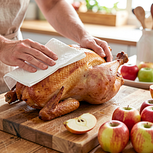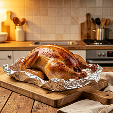 Po upieczeniu wyjmij kaczkę z piekarnika i przełóż na deskę. Przykryj luźno folią aluminiową i odstaw na 15–20 minut — to pozwoli sokom równomiernie się rozprowadzić i mięso będzie bardziej soczyste. W tym czasie zbierz tłuszcz z brytfanny (możesz odlać do słoika i używać do smażenia ziemniaków).