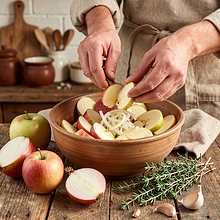 W kuchni polskiej kaczka nadziewana jabłkami to klasyk regionów wiejskich — w czasach, gdy każdy sad miał jabłonie, farsz jabłkowo-cebulowy był naturalnym wyborem do pieczenia drobiu, dając słodko-kwaśny kontrast i pomagając zachować soczystość mięsa.