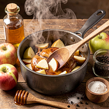 Przygotuj sos z brytfanny: przelej powstały płyn przez sitko do rondla, odcedź resztki (skórki i kawałki). Postaw rondel na średnim ogniu, dodaj pozostałe 100 ml bulionu i łyżkę octu jabłkowego. Dodaj pokrojone 2 jabłka i smaż 6–8 minut aż będą miękkie. W małej miseczce rozmieszaj 10 g mąki pszennej z 20 ml zimnej wody na gładką zawiesinę, wlej do sosu cienkim strumieniem i gotuj 2–4 minuty aż sos lekko zgęstnieje. Dopraw solą i pieprzem do smaku; jeśli sos jest zbyt kwaśny, dodaj odrobinę miodu.