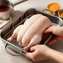Wyjmij kaczkę na 30 minut przed pieczeniem, aby osiągnęła temperaturę pokojową. Rozgrzej piekarnik do 220°C (termoobieg niezalecany do początkowego etapu). Ustaw ruszt w brytfannie tak, aby tłuszcz mógł ściekać. Jeśli masz termometr kuchenny, włóż go do najgrubszej części uda (później będziesz sprawdzać temperaturę).