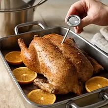 Termometr wkładaj nie dotykając kości. Jeśli nie masz termometru, sprawdź przez nakłucie: jeśli soki są różowe, piecz dalej w 15-minutowych cyklach.