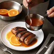 Jeśli chcesz efektownego finiszu i używasz alkoholu, podgrzej sos na małej patelni do temperatury tuż poniżej wrzenia. Zdejmij z ognia, wlej likier pomarańczowy (30 ml) i ostrożnie podpalić (flambować) — trzymaj dłonie i twarz z dala oraz użyj długiej zapalniczki. Pozwól płomieniowi wypalić alkohol (kilka sekund), po czym zgaś i delikatnie zamieszaj sos.