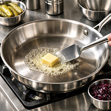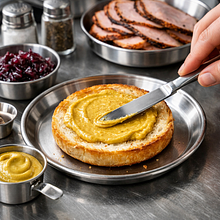 Rozgrzej dużą patelnię na średnio-wysokim ogniu (ok. 6/9). Dodaj 10 g masła i pozwól mu się rozpuścić – będzie się lekko pienić. Rozłóż plastry pastrami z indyka równomiernie na patelni (nie zachodź na siebie). Smaż 1,5-2 minuty z jednej strony aż brzegi staną się lekko chrupiące i pojawią się ciemniejsze plamki. Obróć plastry i smaż kolejne 1-2 minuty. Jeżeli pastrami jest bardzo cienkie, skróć czas do 1 minuty na stronę. Po usmażeniu zdejmij mięso na talerz i przykryj folią aluminiową, aby pozostało ciepłe.