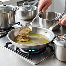Rozgrzej patelnię nieprzywierającą o średnicy 24–28 cm na średnim ogniu. Wlej olej rzepakowy i poczekaj 30–40 sekund aż lekko się rozgrzeje (nie doprowadzaj do dymienia). Ułóż szparagi pojedynczą warstwą, jeśli są bardzo grube możesz przekroić je wzdłuż na pół. Smaż 4–6 minut, obracając co 1–2 minuty, aż pędy będą jędrno-miękkie i lekko zrumienione. Sprawdź gotowość nakłuwając najgrubszą część widelcem — powinien wchodzić z niewielkim oporem, a główki mają być sprężyste. Pod koniec smażenia dopraw 1 szczyptą soli i delikatnie skrop pozostałym sokiem z cytryny.