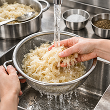 Sprawdź smak kapusty kiszonej: jeśli jest bardzo kwaśna lub ma dużo zalewy, przepłucz ją szybko pod zimną wodą i dobrze odciśnij w dłoniach lub w sicie. Posiekaj kapustę na szerokość 1-1,5 cm. Jeśli kapusta ma grube głąby, usuń twardsze części.