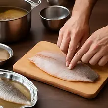 Sprawdź filety z karpia pod kątem ości. Połóż filet skórą do dołu na desce, przesuwaj palcami wzdłuż mięsa aby wyczuć ewentualne ości. Jeśli znajdziesz ości, usuń je pęsetą/kleszczami do ryb prostopadle do mięsa, chwytając u nasady i delikatnie wyciągając. Pokrój filety na porcje o wadze około 160–180 g każda (powinno wyjść ok. 6 porcji). Opłucz szybko pod zimną wodą i osusz papierowym ręcznikiem.
