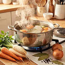 Gdy woda zacznie wrzeć, zmniejsz ogień do małego i gotuj delikatnie 20–25 minut. Celem jest wydobycie smaku z warzyw i przypraw, a nie gwałtowne wrzenie. Wywar powinien być pachnący i klarowny, nie mętny.