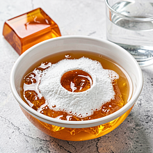 Odlej około 200 ml gorącego wywaru do małego naczynia. Wsyp żelatynę (10 g) do miseczki i zasyp żelatynę 3–4 łyżkami zimnej wody (ok. 30 ml) — zostaw na 5 minut do napęcznienia. Następnie do napęczniałej żelatyny wlej gorący wywar i mieszaj energicznie aż żelatyna się całkowicie rozpuści (powstanie klarowna, wolna od grudek mieszanina).