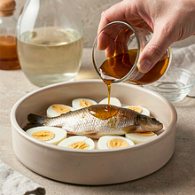 Delikatnie zanurz dzwonka karpia w gorącym (nie wrzącym) wywarze — wywar powinien być mocno gorący, ale nie kipieć (ok. 85°C). Gotuj przez 10–12 minut od momentu powrotu do delikatnego wrzenia. Mięso powinno łatwo odchodzić od ości i być matowe (nie surowe i nie rozpadające). Po ugotowaniu wyjmij dzwonka i odstaw do przestudzenia na 10 minut.