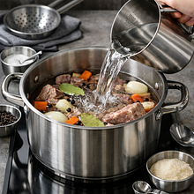 Doprowadź wywar do powolnego wrzenia na średnim ogniu. Gdy pojawią się pierwsze bąble, zmniejsz ogień do małego i gotuj delikatnie 20–25 minut, zbierając łyżką pianę powstającą na powierzchni. Wywar nie powinien gwałtownie wrzeć — łagodny simer pozwala wydobyć smak bez mętnienia.