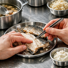 Użyj pęsety do usuwania ości oraz ostrego noża do równomiernego porcjowania. Osuszanie mięsa papierem zapobiega odpryskom podczas wkładania do gorącego wywaru.