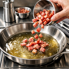 Użyj patelni o średnicy 24–28 cm z grubym dnem. Jeśli nie masz boczku, zacznij od rozgrzania oleju i podsmażenia cebuli.