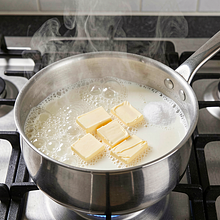 Do średniego rondla wlej 250 ml wody i 250 ml mleka, dodaj 200 g masła, 30 g cukru i 5 g soli. Postaw na średnim ogniu i podgrzewaj do zagotowania — masło powinno się całkowicie rozpuścić. Gdy zacznie wrzeć i powstanie para, natychmiast zdejmij rondelek z ognia.
