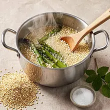 Zalej kaszę 600-700 ml gorącego bulionu warzywnego, doprowadź do wrzenia, dodaj 2 g soli z przewidzianej ilości, zmniejsz ogień do małego i gotuj pod przykryciem 12-15 minut, aż kasza wchłonie większość płynu i zmięknie. Po tym czasie zdejmij garnek z ognia i odstaw pod przykryciem na 10 minut, żeby kasza 'doszła' i zrobiła się kremowa.