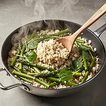 Kremowe kaszotto z kaszy jaglanej ze świeżymi zielonymi szparagami i delikatnie duszonym szczawiem to wiosenny, lekki i pełen witamin obiad lub danie główne na Sylwestra w wersji fit. Kasza jaglana daje przyjemnie orzechową nutę i kremową konsystencję po ugotowaniu na rosole warzywnym, szparagi wnoszą chrupkość i świeżość, a szczaw dodaje charakterystycznej, lekko kwaskowatej nuty, która przełamuje tłustość i łączy składniki w harmonijną całość. Potrawa jest wizualnie atrakcyjna: zielone odcienie szparagów i szczawiu kontrastują z jasną, złocistą kaszą, można ją podać z pokruszonym twarogiem lub natką pietruszki. Idealna do podania z lekkim białym winem, jako danie główne podczas przyjęcia lub ciepły posiłek po aktywnym dniu. Przepis uwzględnia praktyczne wskazówki dla początkujących, jak wypłukać i ugotować kaszę jaglaną bez goryczki, jak przygotować szparagi i jak dusić szczaw, aby zachować smak i kolor.