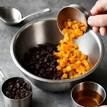 Przygotuj bakalie: rodzynki (150 g) i suszone morele (100 g) umieść w dużej misce. Jeśli używasz rumu (50 ml, opcjonalnie), zalej nim bakalie tak, aby były tylko lekko pokryte, wymieszaj i odstaw na minimum 1 godzinę w temperaturze pokojowej. Jeśli nie używasz rumu, zalej bakalie 50 ml ciepłej wody lub soku pomarańczowego i odstaw. Po namoczeniu odsącz bakalie na sicie i osusz papierowym ręcznikiem — zbyt wilgotne bakalie sprawią, że ciasto będzie zbyt ciężkie.