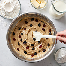 Obtocz bakalie w mące: odważ 30 g mąki z przepisu, wsyp do miski z bakaliami i dokładnie wymieszaj suchą łyżką. Dzięki temu bakalie nie opadną na dno ciasta podczas pieczenia.